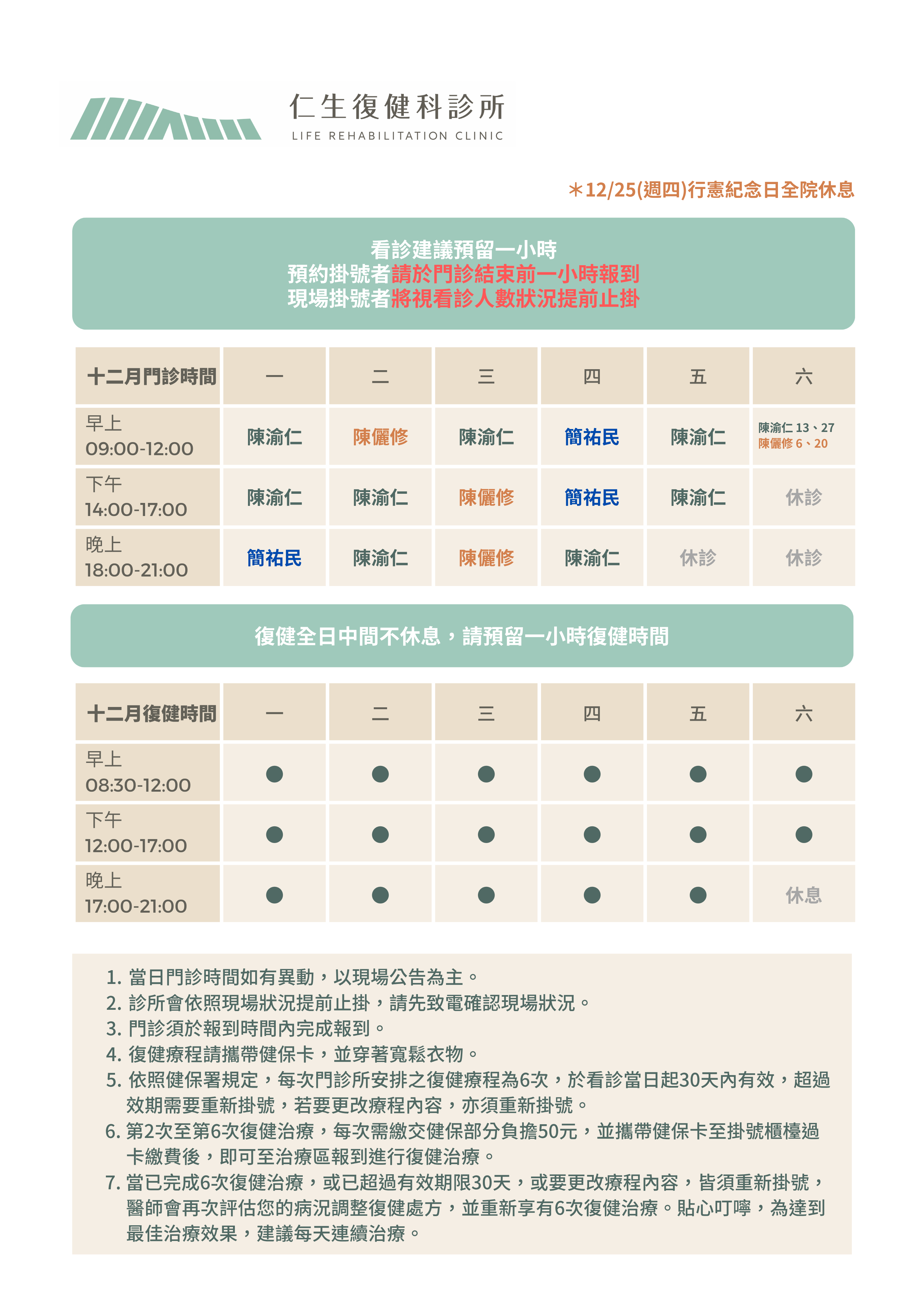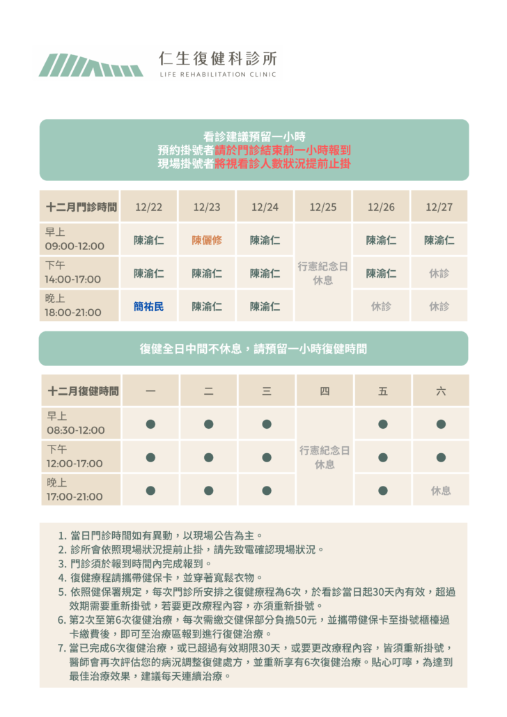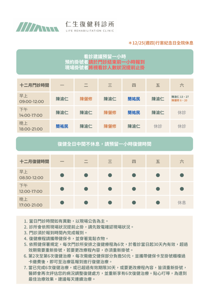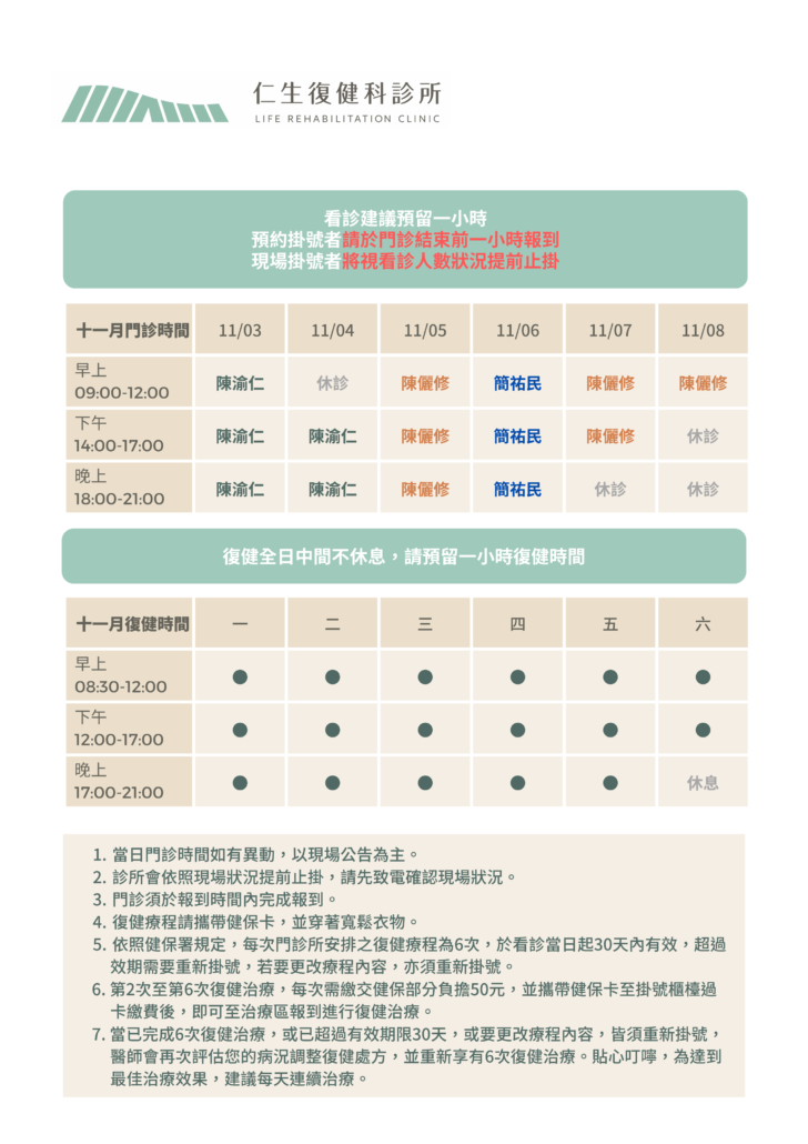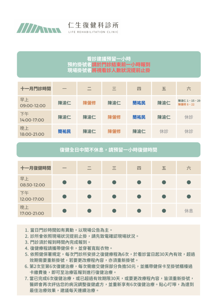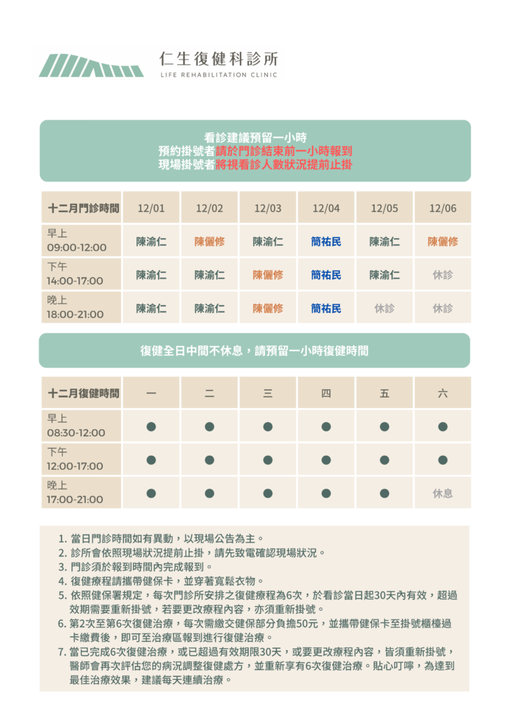 ・根據健保局規定,每看一次復健門診可以做6次復健治療,自治療日起30日內有效,如果超過期限就需要重新掛號呦!